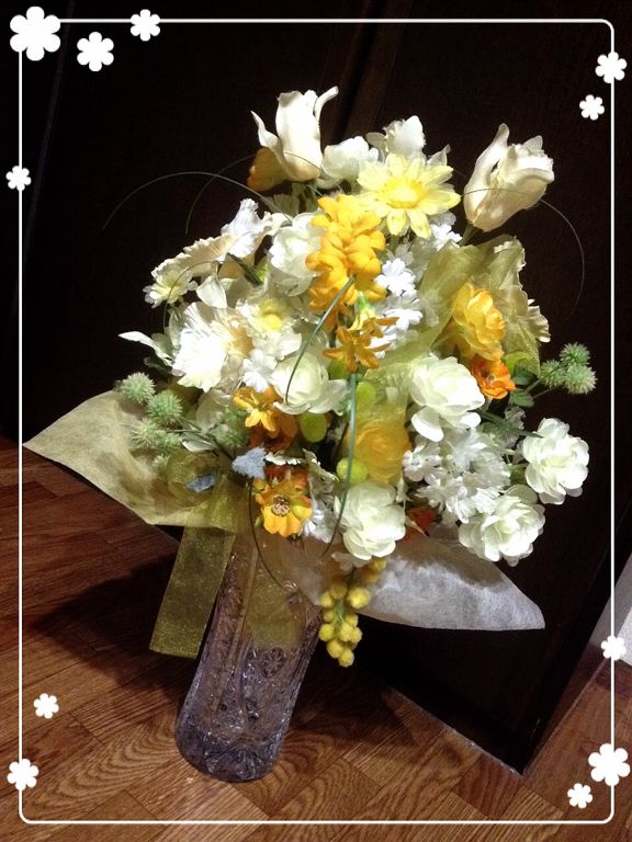 造花でフラワーアレンジメントしました。早速、玄関に飾ります♪